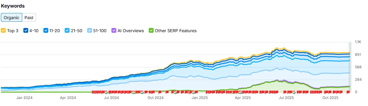 This growth reflects a broad improvement across all ranking tiers, highlighting the strategy’s effectiveness in driving consistent movement across our entire keyword footprint, not just isolated wins.