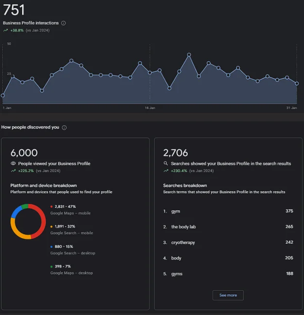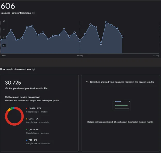 Alongside the website’s organic growth, local visibility through Google My Business Profile (GMB) saw a significant increase in total views, primarily via local map pack positions.